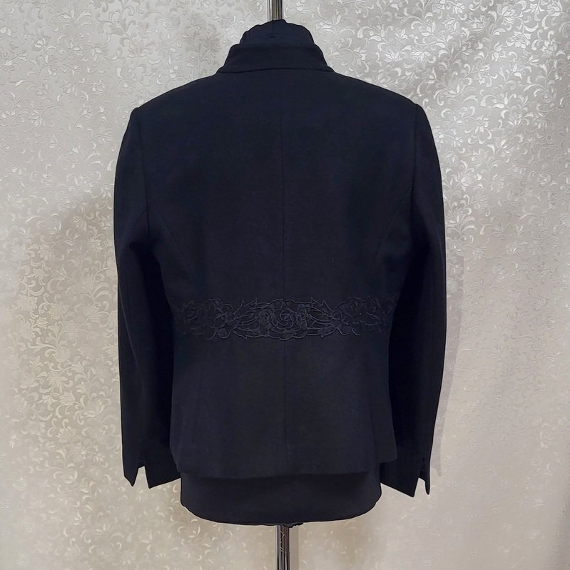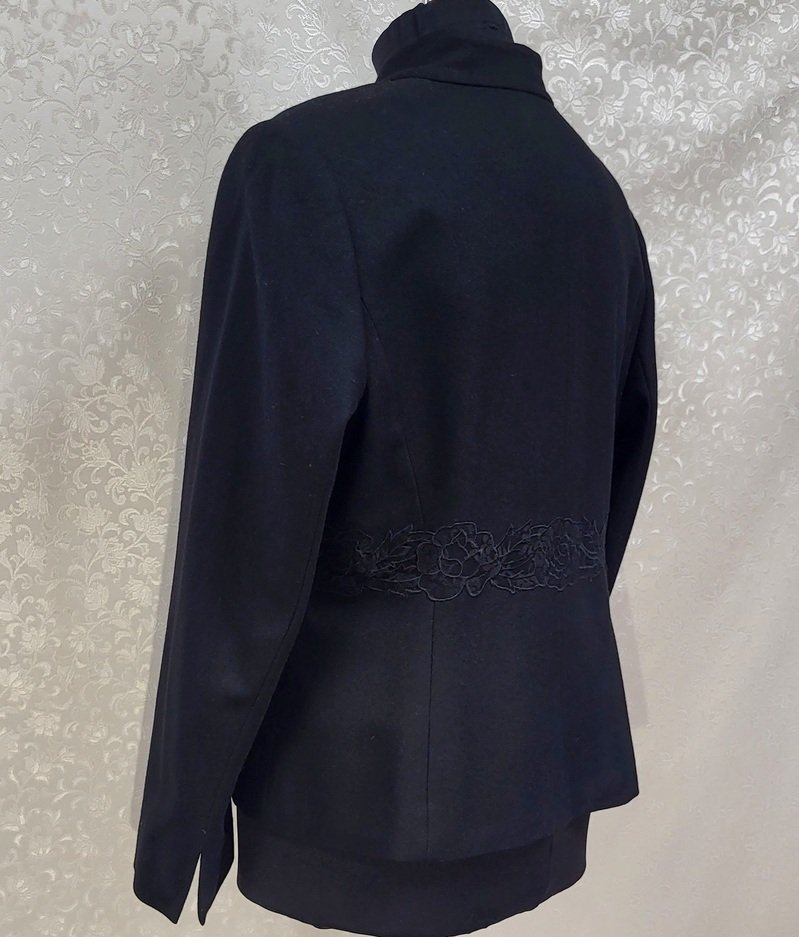 Moteriškas švarkelis, kurio liemuo dekoruotas nėriniu. Rankogaliai su skeltukais.